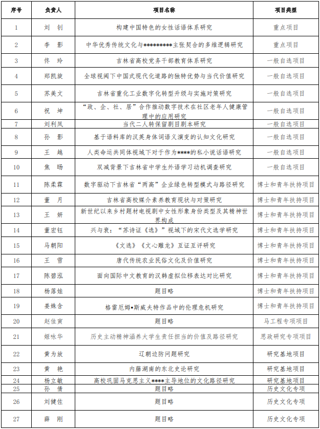 近日,吉林省哲学社会科学基金规划办公室公布了2023年度吉林省社科基金规划项目立项名单,我校共获批27项,其中重点项目2项,一般自选项目8项,博士和青年扶持项目9项,基地项目3项,马工程专项项目1项,思政研究专项项目1项,历史文化专项项目3项。获批数量位列全省省属高校前列。